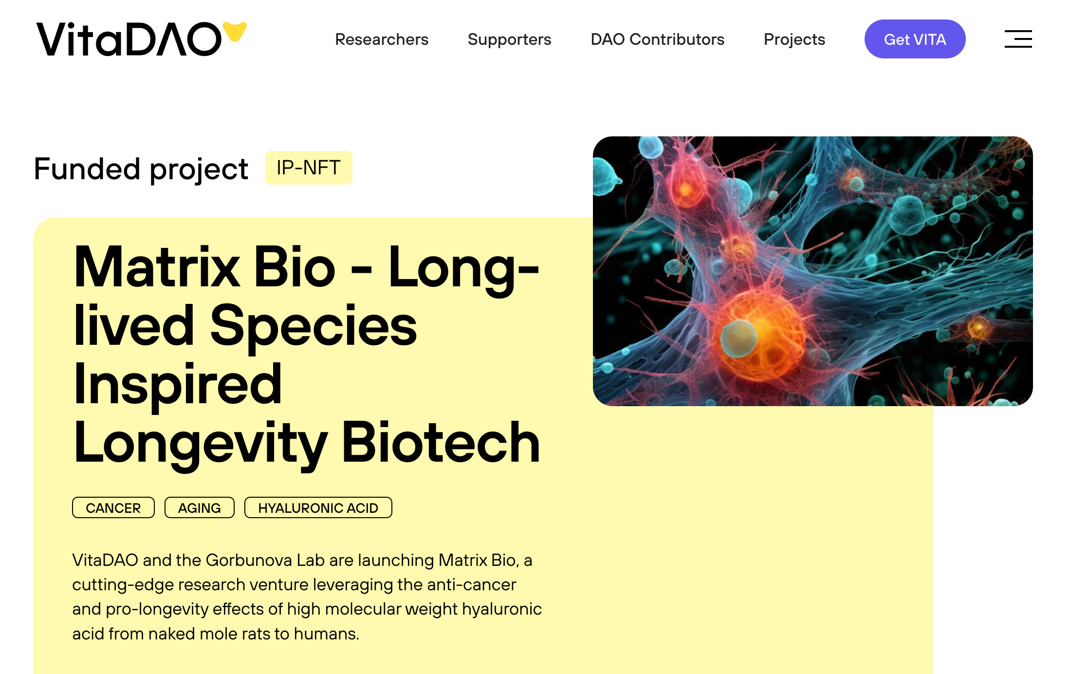 Merkezi olmayan bir bilim kuruluşundan (VitaDAO) fon alan (300.000 $) bir araştırma projesi örneği.