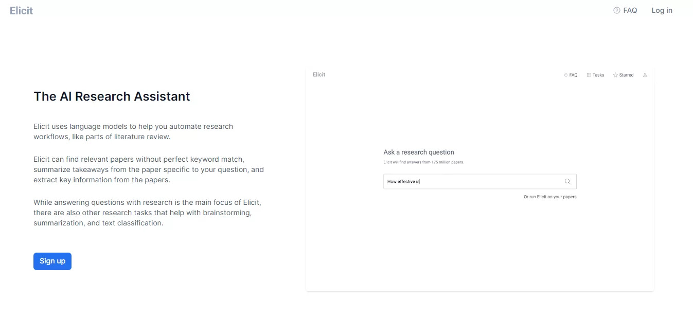 Elicit, araştırmacıların beyin fırtınası yapmalarına, araştırma yapmalarına ve yazmalarına yardımcı olan bir yapay zeka araştırma asistanıdır. Fikirler üretebilir, ilgili bilgileri bulabilir ve argümanların yapılandırılmasına yardımcı olabilir. Elicit ayrıca sunumlar ve posterler oluşturmak için de kullanılabilir.