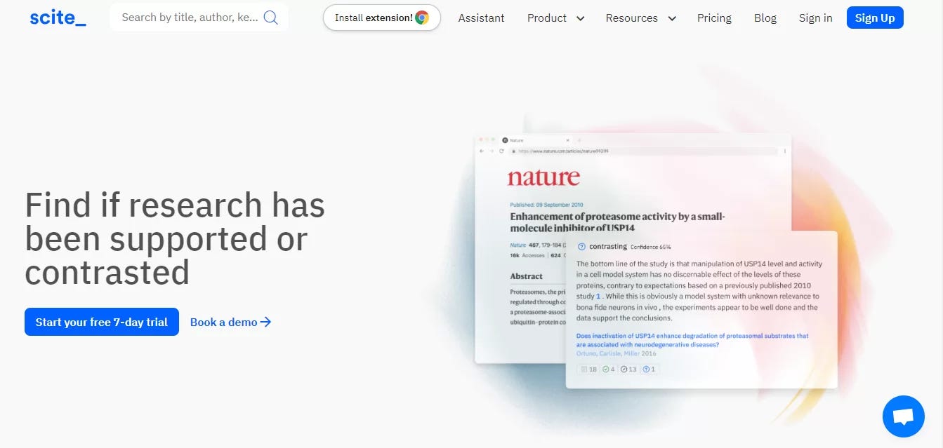 Scite Assistant, araştırmacıların bilimsel literatürü bulmalarına, okumalarına ve anlamalarına yardımcı olan yapay zeka destekli bir araştırma aracıdır. Araştırma sorusu, yöntemler, sonuçlar ve çıkarımlar gibi önemli bilgileri makalelerden otomatik olarak çıkarabilir. Scite Assistant ayrıca araştırmacıların ilgili makaleleri belirlemelerine, ilerlemelerini takip etmelerine ve başkalarıyla işbirliği yapmalarına yardımcı olabilir.